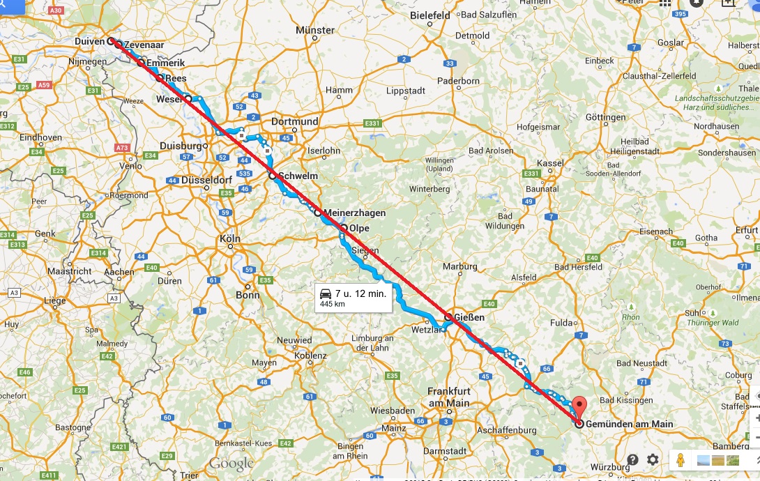 Met de motor naar Gemünden am Main. Het begint met een idee dat je deelt met je vrienden. En je tikt gewoon de burgemeester op zijn schouder. Vervolgens trek je een lijn op de landkaart van een punt in Duiven naar een punt in Gemünden. Die lijn loopt over de mooiste kronkelwegen langs de Rijn, over het Ruhrgebiet, dan via het Westerwald en Spessart tot in de kop van Beieren waar Gemünden ligt. Tja, net langs die lijn lopen ook snelwegen dus je zou met 170 km/u er in een paar uur kunnen zijn. Dat doen we niet.